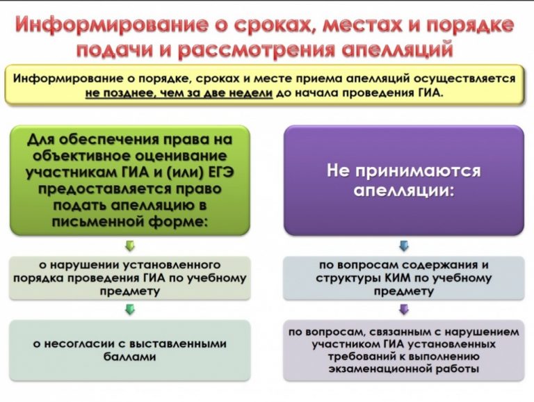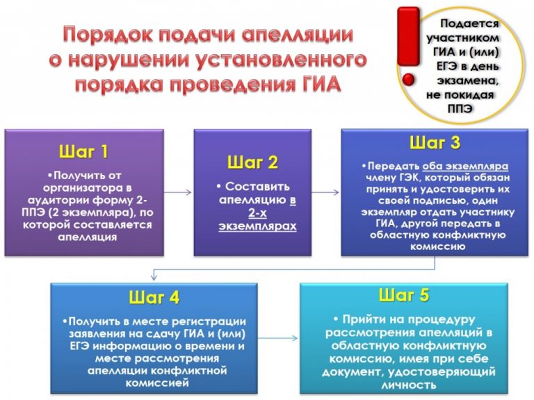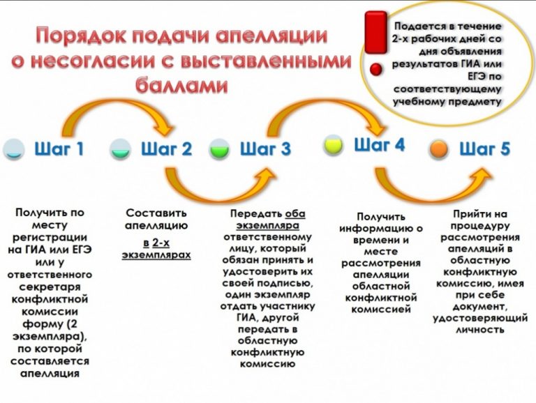 Апелляция 25 июля 2024 Для обеспечения права на объективное оценивание участникам ЕГЭ предоставляется право подать в письменной форме апелляцию: — о нарушении установленного порядка проведения ЕГЭ по общеобразовательному предмету; — о несогласии с выставленными баллами. Не принимаются апелляции: — по вопросам содержания и структуры КИМ по общеобразовательным предметам — по вопросам, связанным с нарушением участником ЕГЭ установленных требований к выполнению экзаменационной работы. Порядок, сроки и место приема апелляций доводятся до сведения участников ЕГЭ, их родителей (законных представителей), руководителей образовательных учреждений не позднее, чем за 2 недели до начала проведения ЕГЭ. Для рассмотрения апелляций в каждом регионе создаются конфликтные комиссии. Они обеспечивают объективность оценивания экзаменационных работ и разрешение спорных вопросов, возникающих при проведении государственной (итоговой) аттестации. Апелляции тех участников, которые сдают ЕГЭ за пределами территории Российской Федерации, рассматривает федеральная конфликтная комиссия. При рассмотрении апелляции может присутствовать участник ЕГЭ и (или) его родители (законные представители), а также общественные наблюдатели. ПРАВИЛА ПОДАЧИ АПЕЛЛЯЦИИ О НАРУШЕНИИ УСТАНОВЛЕННОГО ПОРЯДКА ПРОВЕДЕНИЯ ЕГЭ Апелляция о нарушении установленного порядка проведения ЕГЭ подается участником ЕГЭ в день экзамена,не покидая ППЭ. Действия участника ЕГЭ: — получить от организатора в аудитории форму 2-ППЭ(2 экземпляра,скачать), по которой составляется апелляция; — составить апелляцию в 2-х экземплярах; — передать оба экземпляра уполномоченному представителю ГЭК,который обязан принять и удостоверить их своей подписью, один экземпляр отдать участнику ЕГЭ, другой передать в конфликтную комиссию; — получить информацию о времени и месте рассмотрения апелляции конфликтной комиссией. Для проверки изложенных в апелляции сведений о нарушении установленного порядка проведения ЕГЭ уполномоченным представителем ГЭК создается комиссия и организуется проведение проверки. В состав комиссии могут включаться руководитель ППЭ, организаторы, общественные наблюдатели, медицинские работники и представители правоохранительных органов. Результаты проверки оформляются в форме заключения комиссии. Апелляция и заключение комиссии о результатах проверки в тот же день передаются уполномоченным представителем ГЭК в конфликтную комиссию. Конфликтная комиссия рассматривает апелляцию о нарушении установленного порядка проведения ЕГЭ не более 2-х рабочих дней и выносит одно из решений: — отклонение апелляции; — удовлетворение апелляции. В случае удовлетворения апелляции результат ЕГЭ участника аннулируется, и участнику предоставляется возможность сдать ЕГЭ поданному предмету в другой день, предусмотренный единым расписанием. ПРАВИЛА ПОДАЧИ АПЕЛЛЯЦИИ О НЕСОГЛАСИИ С РЕЗУЛЬТАТАМИ ЕГЭ Апелляция о несогласии с результатами ЕГЭ подается втечение2-храбочих дней после официального объявления индивидуальных результатов экзамена и ознакомления сними участника ЕГЭ. Выпускники текущего года могут подать апелляцию о несогласии с выставленными баллами в образовательное учреждение, в котором они были допущены в установленном порядке к государственной (итоговой) ат